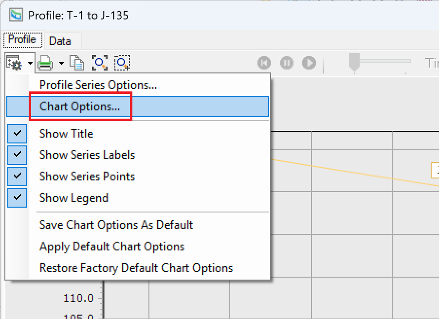 At this window you can always use the drop down arrow at the first icon on the top of window that looks like a chart to bring you back to the profile series options, so that you can add or remove some properties from your profile. You can also use the drop down arrow on the second icon from the right to change chart options such as color of lines, increment used on the axes, label of the property in the legend, style of the line displayed, etc....