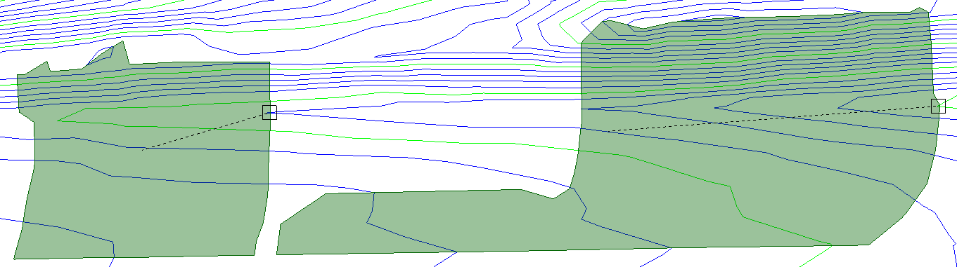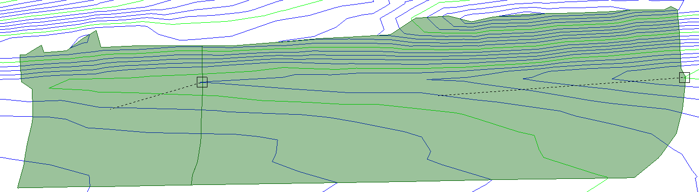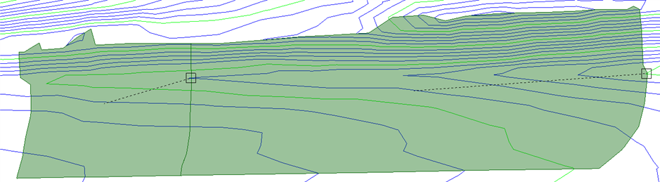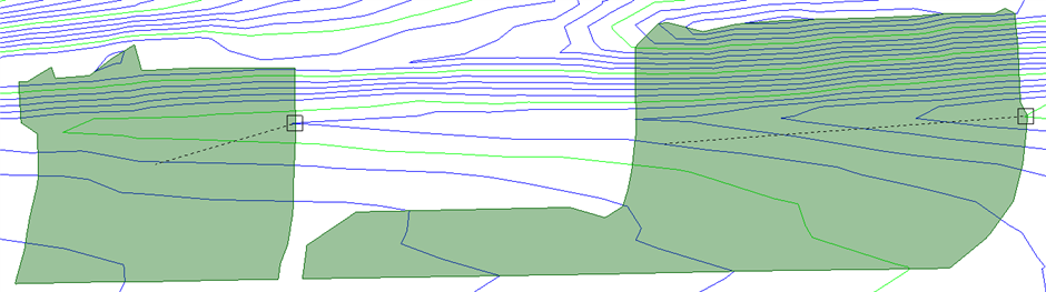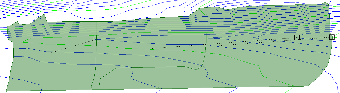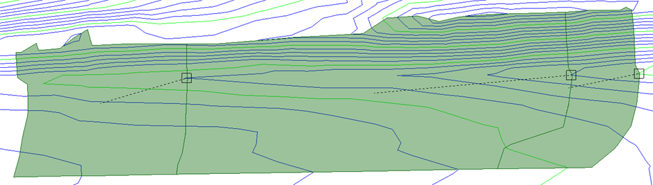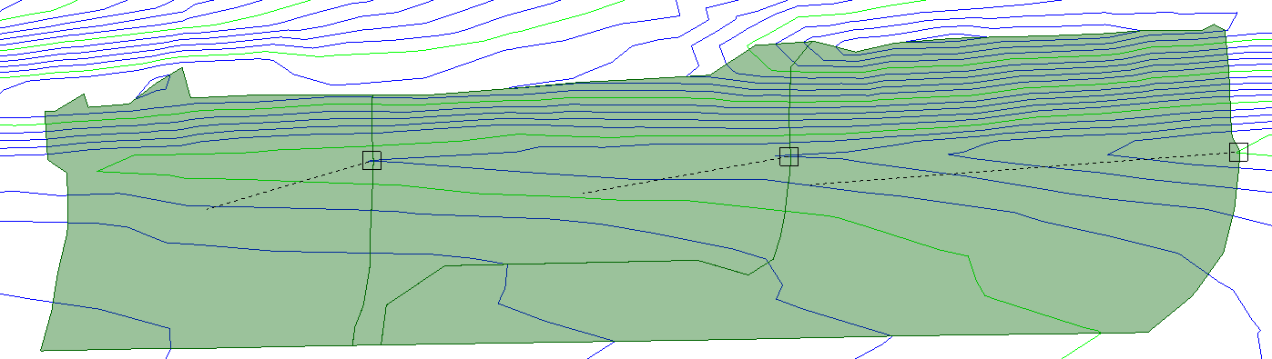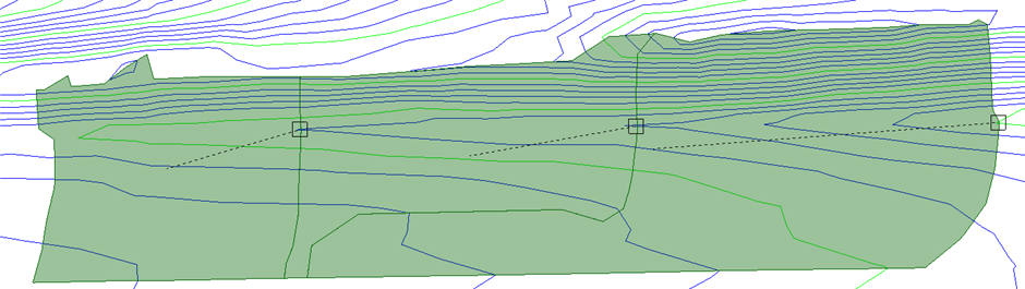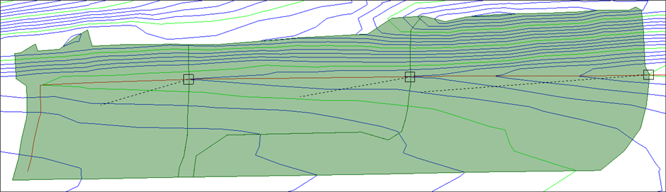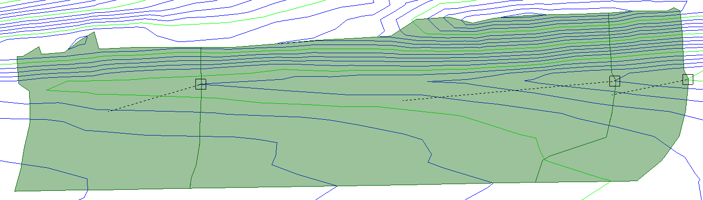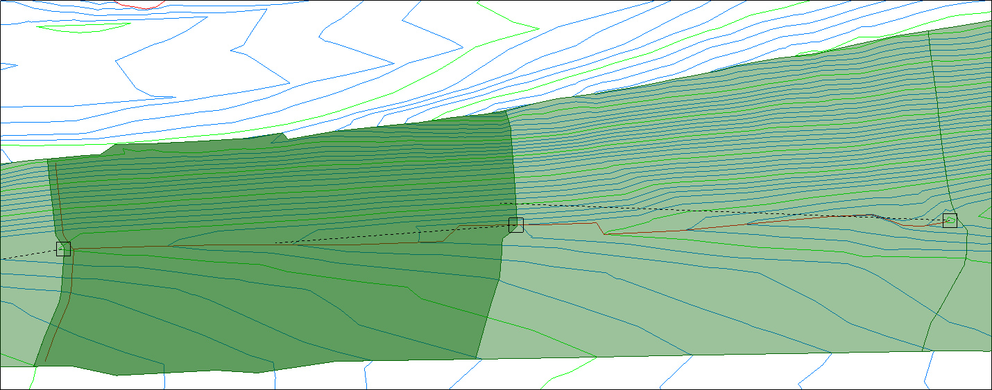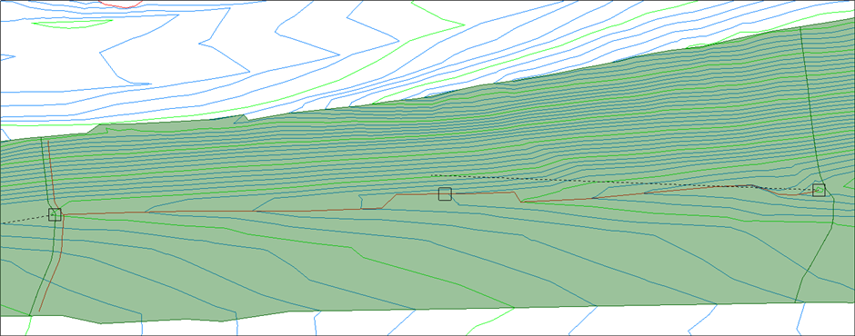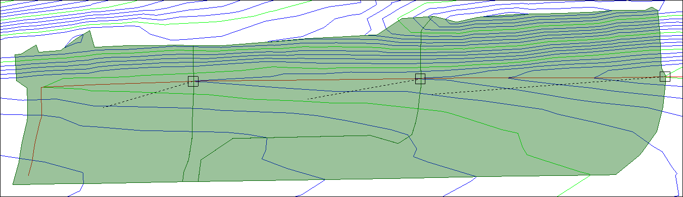 When the "Run Catchment Delineation" button is enabled, moving a catch basin will automatically update the contributing catchment area as well as adjacent downstream catchment areas. For example, when the middle catch basin below is moved to the right, the downstream catchment boundary is automatically updated.