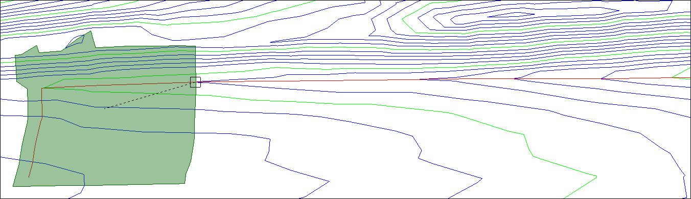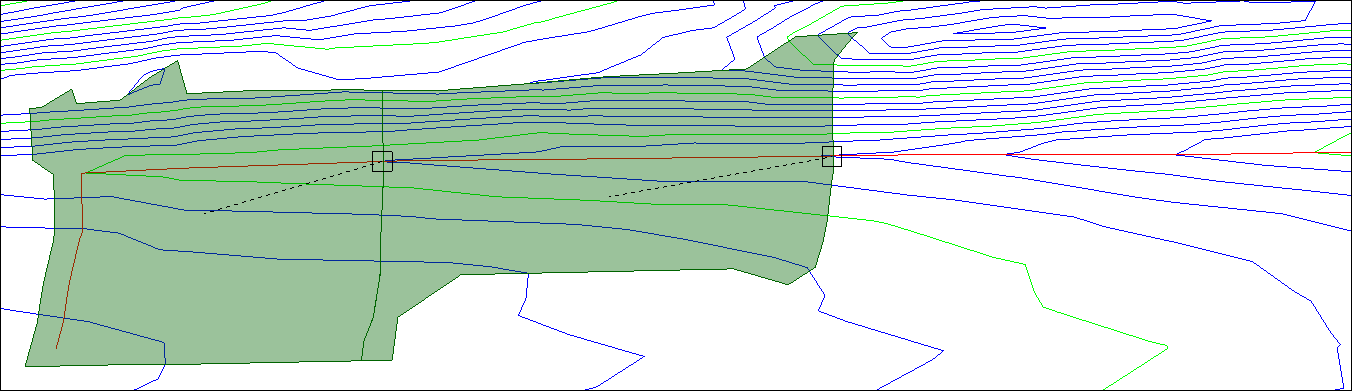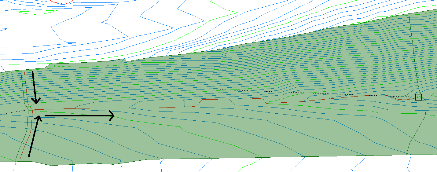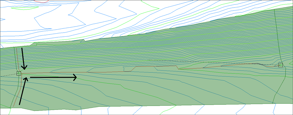 Example of misplaced catchment (catch basin is not on downstream trace line)