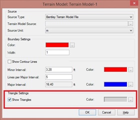 When adding a terrain model, you now have the ability to show the Civil product triangles or TIN (Triangulated Irregular Network) when loading the file. Triangles can be useful when reviewing catchments that are generated from using the Terrain Model. In addition, Triangles can be useful when doing the downstream water-drop trace.