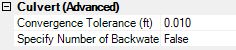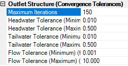 2) Check all input parameters and adjust the Convergence Tolerance options if needed - review at the root outlet structure component's configuration, as well as each individual component, to ensure that input parameters are correct. If the culvert barrel is flat, consider adding a small amount of slope. If the convergence issues persist, try increasing the "Maximum Iterations" value (seen when clicking the root composite outlet structure name on the left side). If that does not help, try setting the "Convergence Tolerance" (seen within the culvert component properties) to a larger number, to make convergence easier to achieve. For example 0.01 or 0.1 feet. When doing this, be sure to review the overall rating curve to make sure it is still smooth.