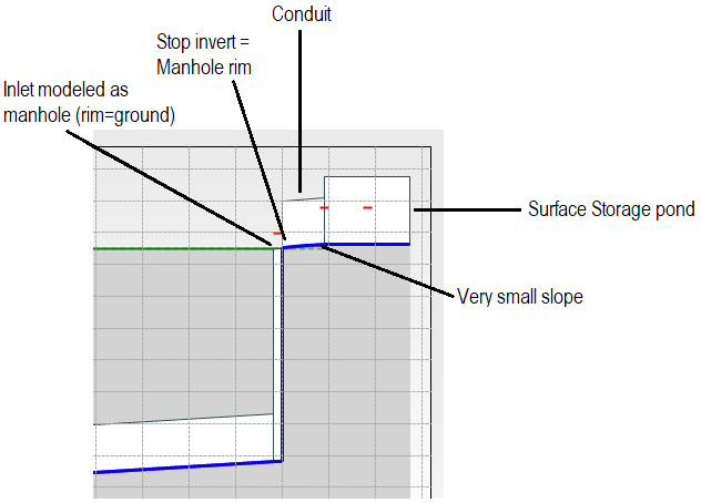 Another approach would be to connect the short conduit between the pond bottom and the inlet (manhole) rim elevation. Meaning, set the conduit stop invert equal to the manhole rim. This will enable the numerical solver to "see" this conduit essentially as a gutter between the inlet surface and the pond. The pond outlet structure orifice or riser crest elevation would be set equal to the pond bottom. See below screenshot of the profile view:
