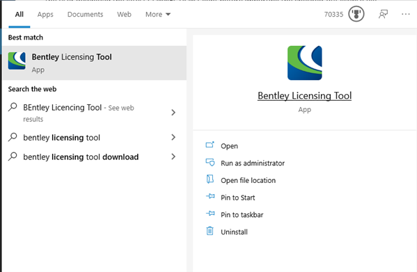 6. Import the downloaded license file into the Bentley Licensing Tool. To do this, first open the Bentley Licensing Tool from the Start menu.