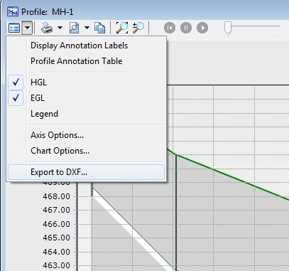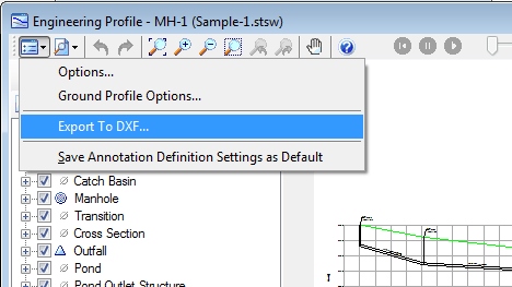 2) To export a profile in SewerCAD, SewerGEMS, CivilStorm or StormCAD, open the profile, click the Options button in the upper-left corner and choose to Export to DXF.