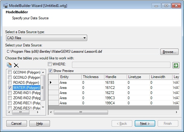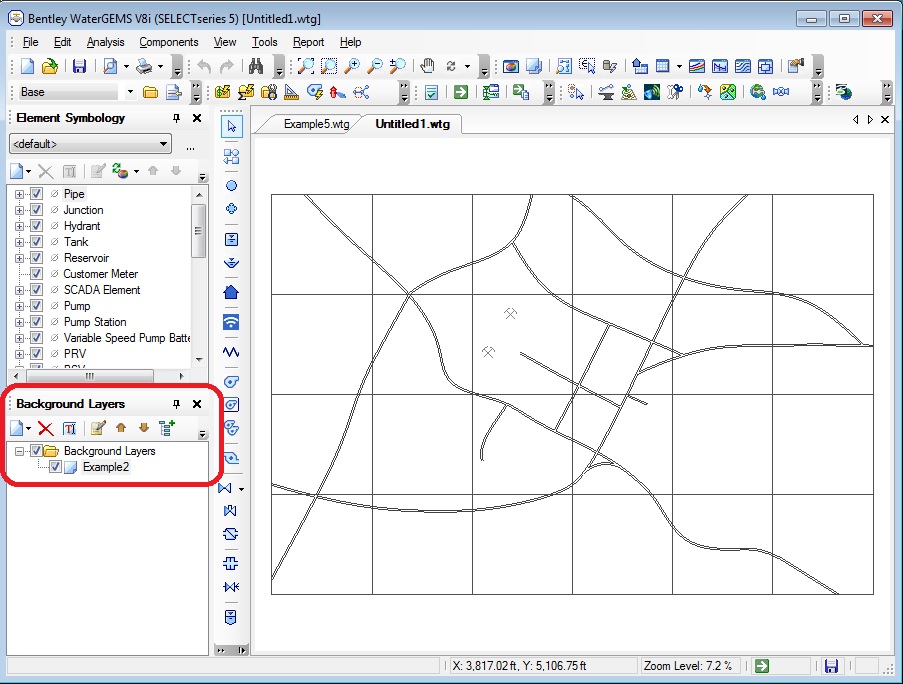 Using a CAD file background as a guide to trace your water elements can be helpful, but existing linework can also be automatically imported and converted into hydraulic elements using the ModelBuilder tool. This is useful if your elements (Pipes, conduits, junctions, etc) already exist in your CAD file and you simply want to create a hydraulic model.
