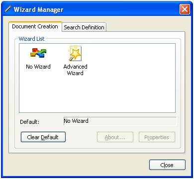 - Clear Default / Set as Default — Clicking the Clear Default button signifies that you do not want to commit to a default document creation method. When you click Clear Default and the --no default wizard-- message appears in the dialog, this means that the Select a Wizard dialog will open whenever you select Document > New > Document, whenever you create multiple documents using the Create Multiple dialog, and whenever you copy or move documents using the drag and drop method. Clicking the Set as Default button sets whatever method (icon) you select from the list as the default method for creating documents.
