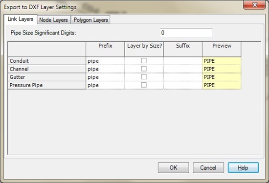 Note that specifying a prefix or suffix also creates new layers for each prefix/suffix. If no prefix or suffix is specified all links, nodes, and polygons will be exported to the same DXF layer.