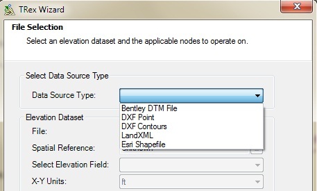 In addition to previously supported file formats, the TRex tool in StormCAD now supports the Bentley DTM file format. This is available through the Data Source Type pulldown.