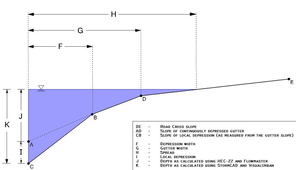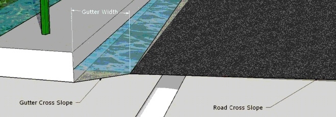 In your gutter if the property for "Depressed Gutter?" is set to 'True' there is a steeper slope right near the curb, for the entire length of the gutter, which is the gutter cross slope property. There would also still be a road cross slope value, so, in total, there would be two different slopes or a "composite" gutter section. This composite gutter is depicted in the following diagram: