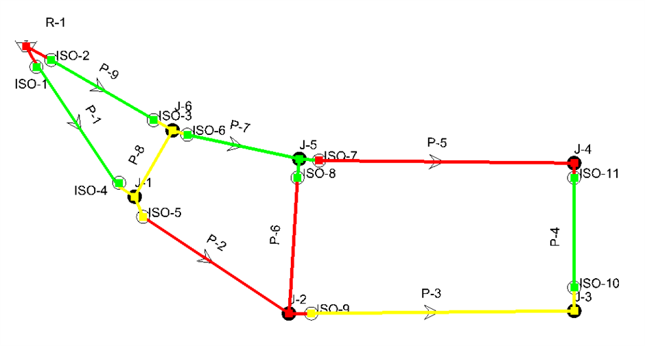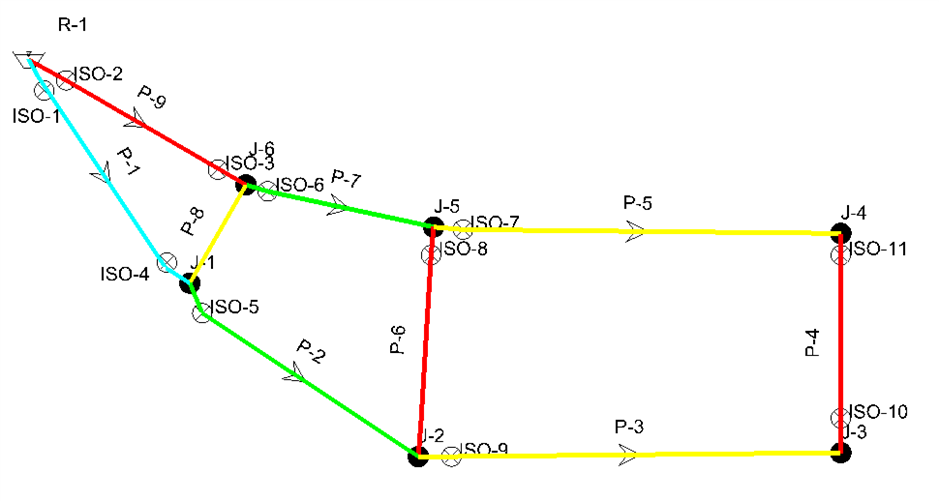 If the "Consider Valves?" option is enabled, then the segments (identified by color) are created based on valves that can be closed. The segments are identified by color in the figure below. Note that the various colors assigned to elements by the program are not representative of any network attribute, but are only used to differentiate adjacent segments.