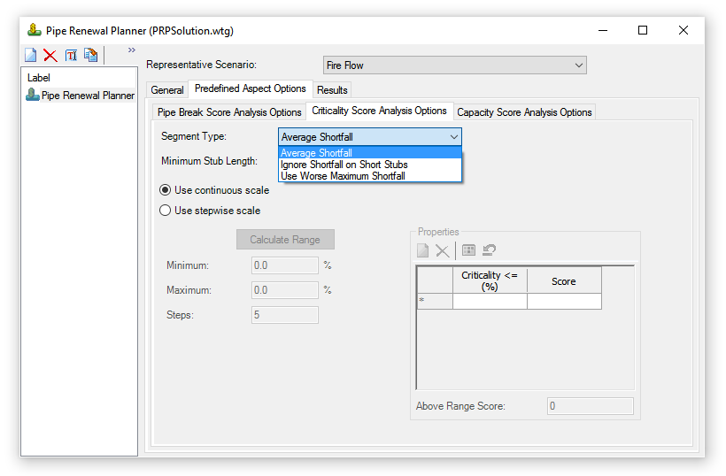 When a Criticality analysis is computed with the option "Consider Valves" enabled, there is not a one-to-one association between segments and pipes. A pipe may be made up of several segments depending on valving. The user has the ability to control how the segment shortfall is transformed into pipe shortfall.