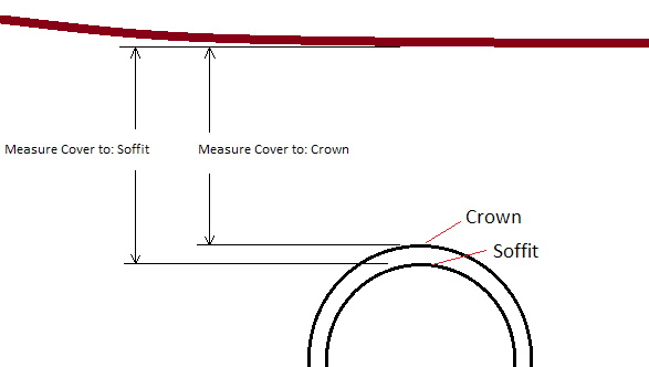 The "Measure Cover to" option in the design constraints dialog refers to the depth of fill above the pipe top. Selecting Soffit means that the cover is measured as the distance between the top of the inside of the pipe to the ground elevation. Selecting Crown means that the cover is measured as the distance between the top of the outside of the pipe to the ground elevation.