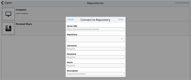 You can add as many repositories as you want and they will appear in your repositories list. You will not be asked to login to the repository again after the connection is made unless your password changes. At any time, you can edit the connection to change your password or name of connection. If you no longer want to keep the connection, you can delete the repository and all favorites, folder shortcuts and connection credentials are deleted.