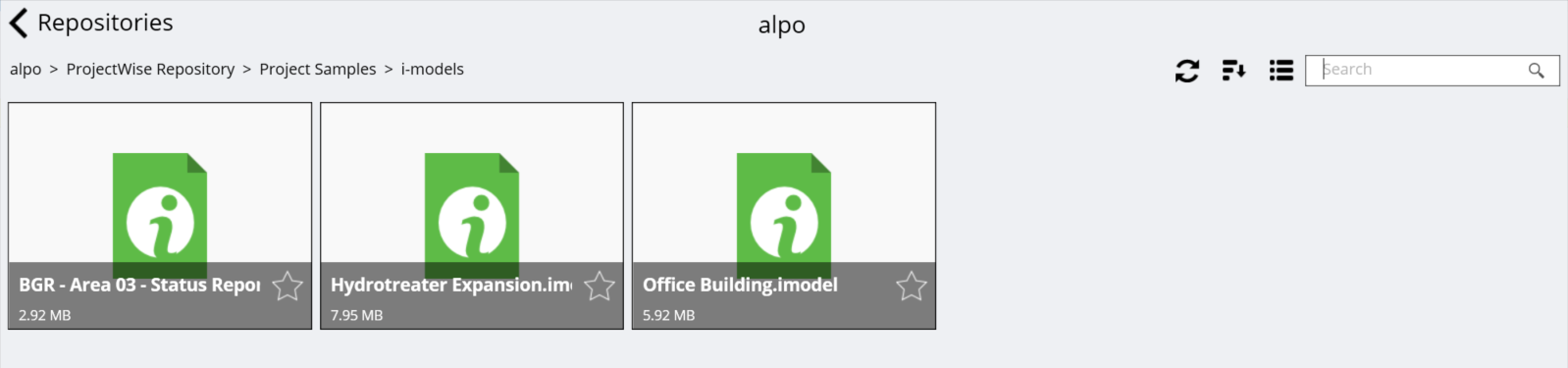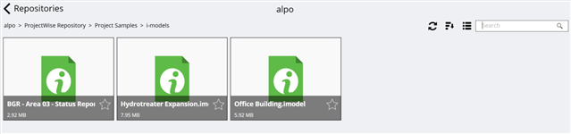 Once you are connected to a server, you can select that repository from the list and navigate through the folders to find the i-model you want. Navigating the folder list is very easy; the view shows the content in the current folder you are in. The folder path displays in the upper left and you can select any folder in the path to go directly to it. You can filter what displays on the screen at anytime by using the search bar. If you need to go back to the list of repositories, select the < Repositories link in the upper left.