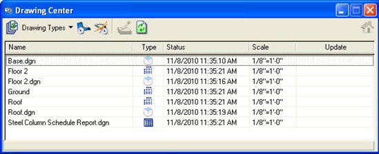 The Structural Drawing Center is a centralized utility that manages automated Structural drawings generated from the active project model. The Drawing Center is typically used after the import process. It can be accessed from the Drawing Manager task.