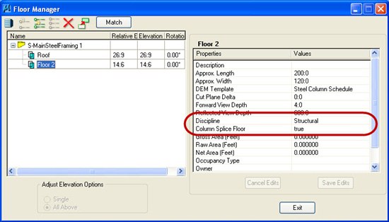 RSS handles columns on a story-by-story basis. In other words a column that spans several floors will be modeled in RSS as separate elements, one for each floor, whereas SM columns are usually modeled as one element. The Bentley BIM Floor Manager has properties that can allow for splicing columns at each floor during the RSS export operation. Each floor in the Floor Manager contains informational properties including Discipline and Column Splice. Setting the Discipline value to 'structural' and the Column Splice Floor to 'true' will facilitate splicing the columns at the floor heights.