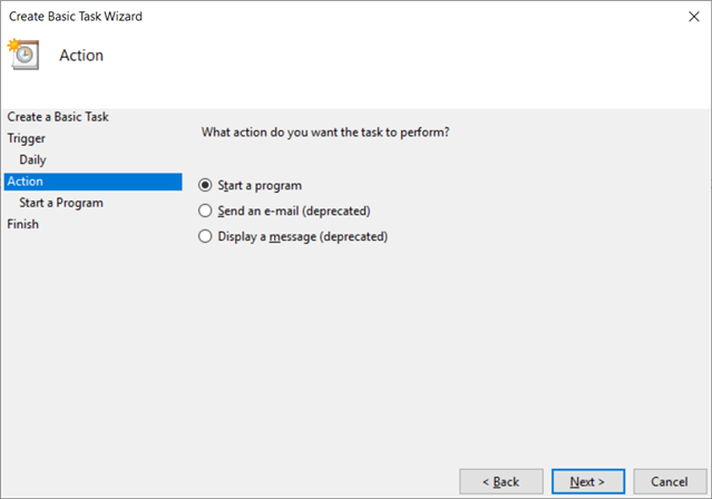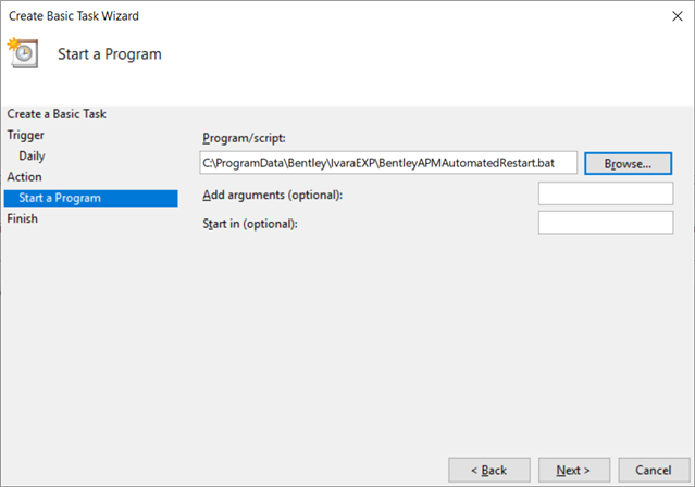 5. Next, choose Start a Program and Browse for the .bat file created in Step 2.