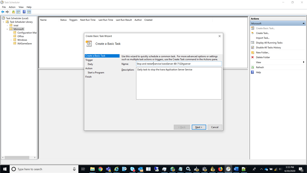 3. Open Windows’ Task Scheduler application. In the Actions box (top-left) launch “Create a basic task…”