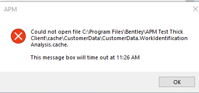 The error indicates that the user is running with cache in the thick client that they are using and they are either not permitted to modify the contents of the cache folder or that files are missing in the cache folder. Unless you are experienced to generating cache and understand Bentley APM architecture and running with cache, we suggest to first check with Bentley APM Support via an SR or contacting your Bentley APM Consultant before changing your approach.