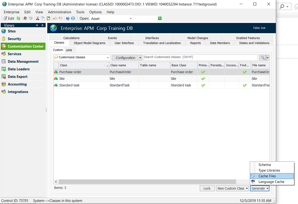 Next, stop all services and thick-clients. On the Application server launch a thick-client with the Admin key. Go to the Enterprise level > Customization Center view > Classes tab > Custom subtab. Click on the Generate button in the lower right corner of the screen and select Cache. This may take several minutes to complete.
