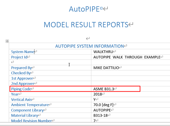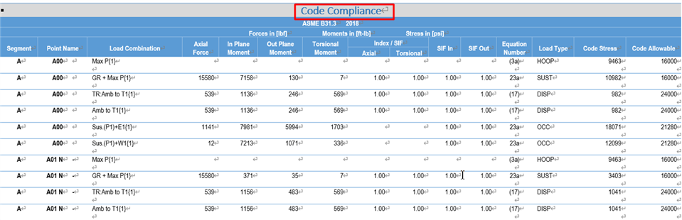 以下图中生成CodeCompliance应力信息为例:生成的文档中表头名称为Code Compliance;管道编码信息(Piping Code)为ASME B31.3。