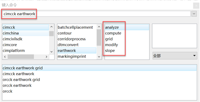 如下图所示,其中包含了绘制方格网命令cimcck earthowork,修改方格网命令cimcck earthwork modify,土方计算命令cimcck earthwork compute,填挖注释命令cimcck earthwork analyze。