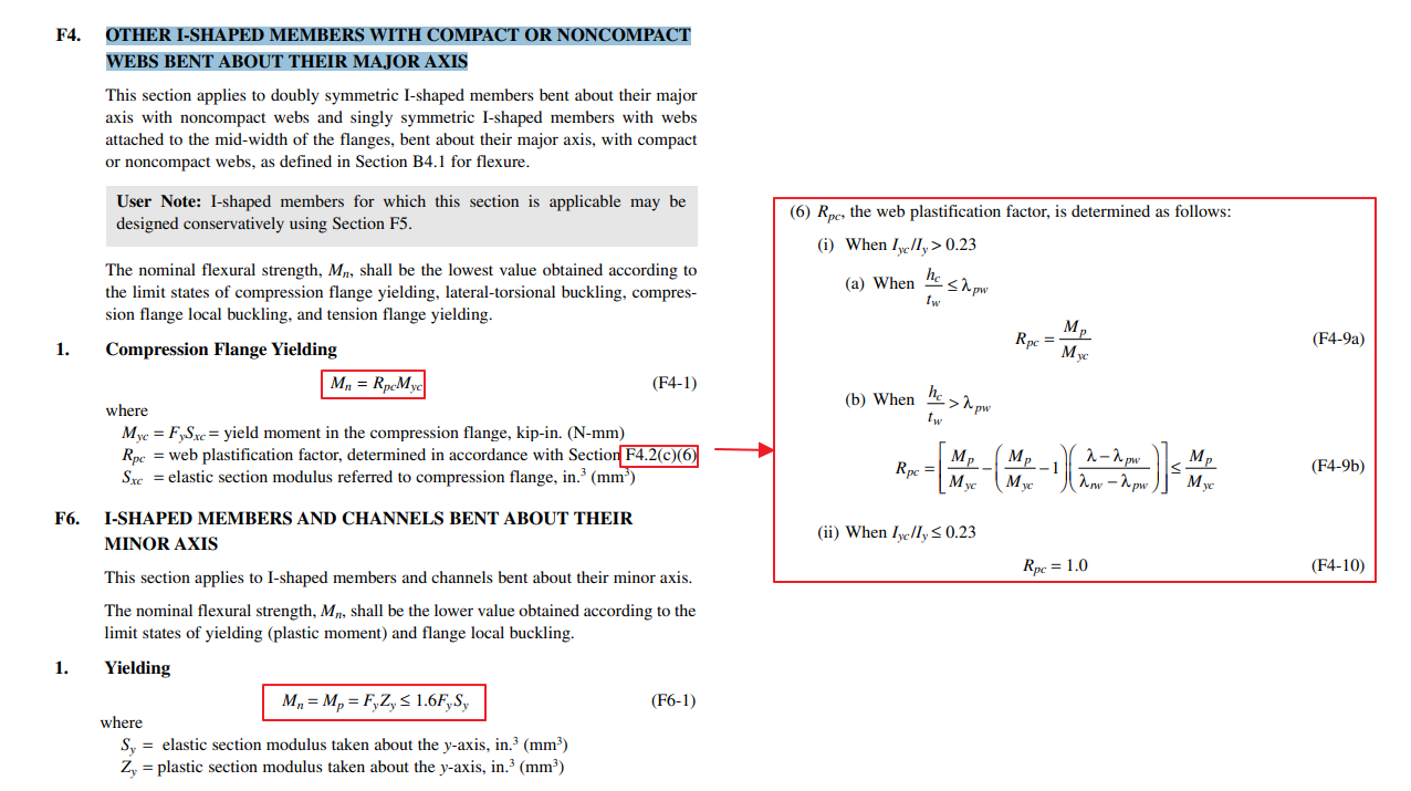 其中Mcx和Mcy是按照F章内容执行的,由于您使用的是General截面,软件是按照I型截面验算考虑的,如下图所示,主轴x的计算公式中有系数Rpc需要根据F4.2(c)(6)条规定,分条件给出,因此自定义General截面的主轴Mcx并不是一定与Mcy一致的。而Mcy的计算公式中只有FyZy。