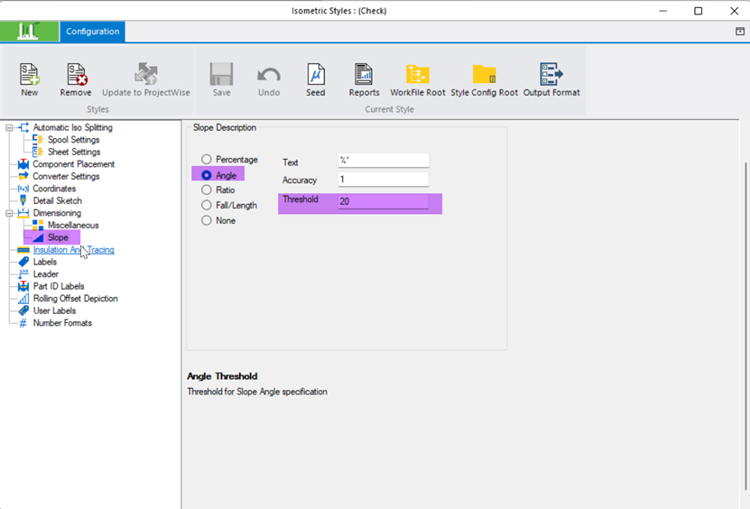 2.点击Slope,选择Angle,将Threshold(阈值)调整到一个大于管道倾斜角度的值。根据帮助文档中对阈值的定义,如果管道的实际倾斜角度小于阈值的设定值,那么管线将水平显示,并在管线上显示倾斜角度。