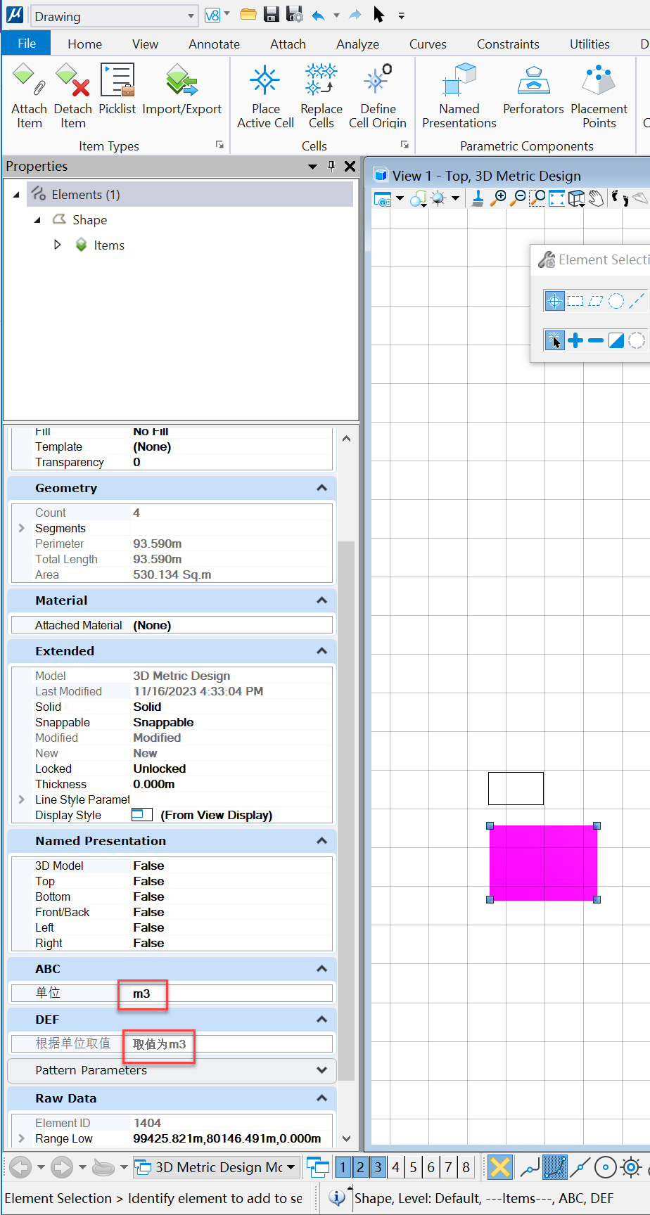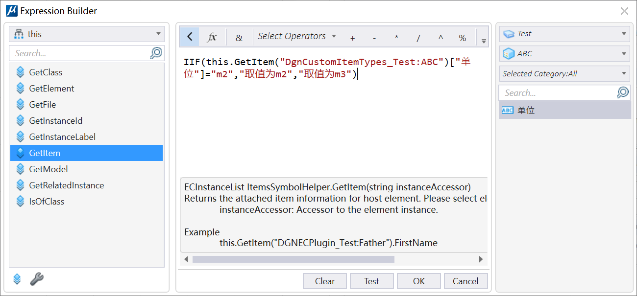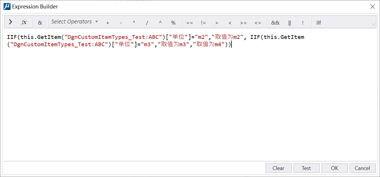 IIF(this.GetItem("DgnCustomItemTypes_Test:ABC")["单位"]="m2","取值为m2","取值为m3")