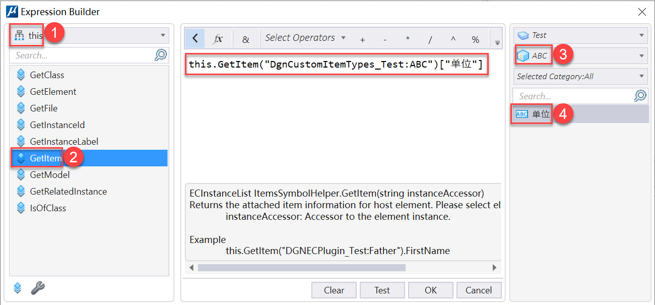 我们先打开计算属性的Expression Builder,先选择this, 然后选择GetItem, 选择单位所在的ItemType,最后选择单位。这样就可以在计算中引用单位了