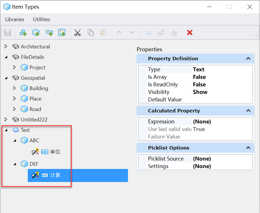 例如有这样的一个需求:现在又ABC和DEF两个ItemType,他们下面分别有单位和计算属性。其中单位的属性值是m2. 那么如何在计算属性下引用单位属性呢?