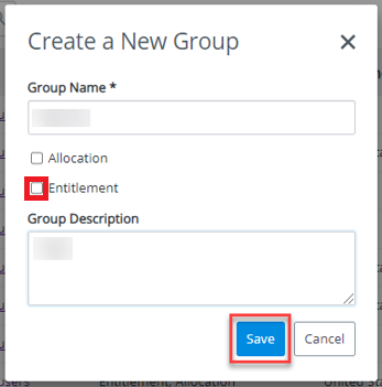 1.首先创建用户授权组:请参考此链接创建用户授权组, 创建时需要选择Entitlement(授权)类型(如需分组导出使用量报表,也可以同时选择Allocation分配组选项)。