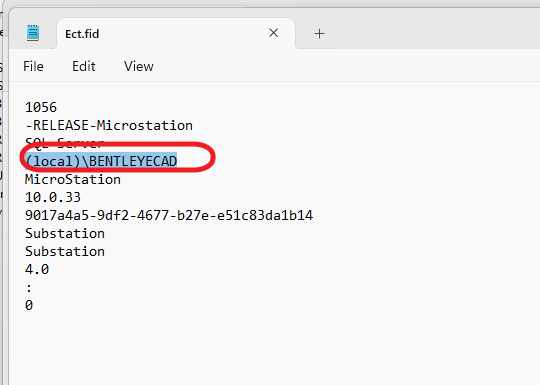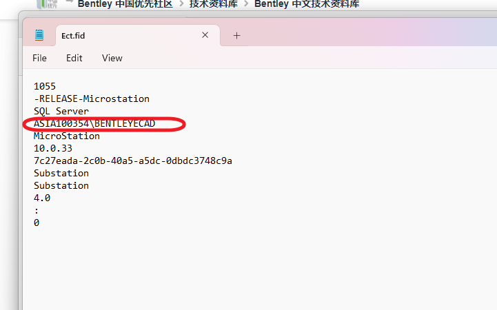如上图所示,如其服务器名称为 '(local)\BENTLEYECAD',则此机器上所创建的工程文件夹中的ect.fid文件中,也会记录该字段: