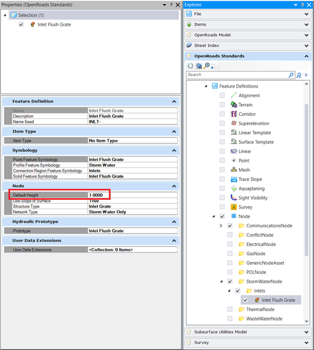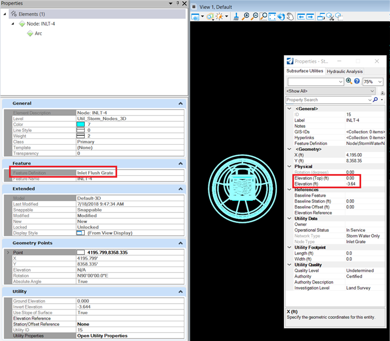 加起来是 3.64 feet。特征定义中设置的 Default Height 是 1。这个值比 3.64 feet 小,节点的底部高程将在放置节点时输入高程的下方3.64 feet 。这个节点放置时输入的高程为0,那么我们查看Utility Properties,您会发现节点的的底部高程为 -3.64 feet: