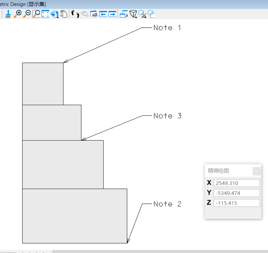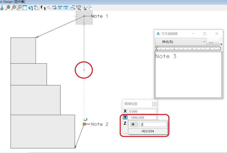3. 继续添加批注,这时希望该批注能够放在前两个批注的中间位置,这时需要用到精确捕捉对话框。先重复上面的步骤,文本编辑器输入”Note 3”,起点放置在Note1和Note2之间,然后将鼠标移动到Note 1处按“O”,然后移到 Note 2处,这时在精确捕捉对话框中点击除号”/2”;
