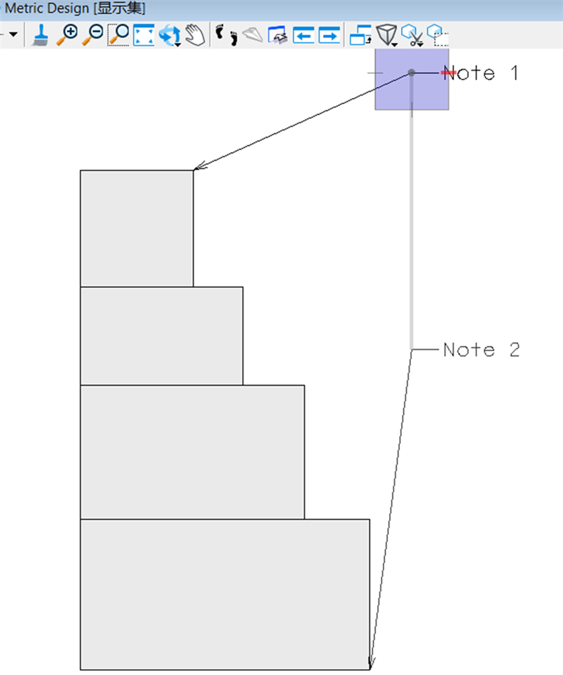 2. 在图中批注最上面的角点为 “Note 1”,然后修改批注为“Note 2”,点击下角点,这时将光标放到如图所示的位置并按下字母"O",按下Enter,会发现标注的引线被固定在了一条垂直直线上,这条直线的作用是将Note 2与Note 1对齐,最后点击鼠标左键确认放置位置;