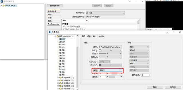 我们在OBD中选中栏杆,点击鼠标右键,弹出的对话框中选择建筑元素信息,点击更多信息,找到投影线,把投影线的类改为"构造"即可,