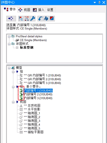 A. 生成的图块(detail block))和图纸(sheet) 在浏览器中的显示状态:灰色代表未生成任何,蓝色代表已生成图块,黄色代表生成图块后图发生了变化,绿色代表已生成了图纸或插入了图块,红色代表生成图纸后图发生了变化