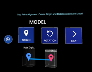 此功能应用于以真实比例进行实际现场与数字模型的重叠。当选择 SPATIAL ALIGNMENT(空间对齐),可以看到新的选项,用来设置Model Origin pin(模型原点)来标识为原点,并在数字模型内设置ROTATION(旋转)。