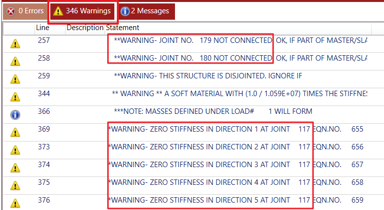 可以看到该模型阵型显示是合理的,但是Output结果中有大量没有连接的节点,如 节点179和节点180; 还有大量零刚度节点如节点117;这种情况,一般情况下Not Connected节点是,杆件相交的节点没有重合,应该是有个很小的间隙,而刚度为0的点应该是缺少约束的点。