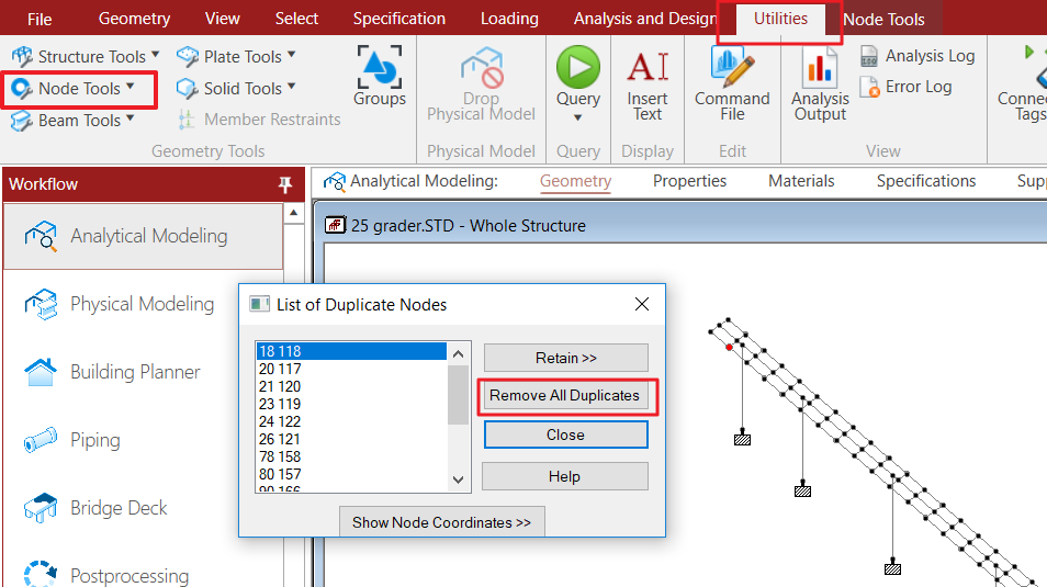 然后我们再用Utilites菜单中的 Beam tools中的Duplicate Beam和Zero Length来检查是否有重复的构件或者零长度的单元。