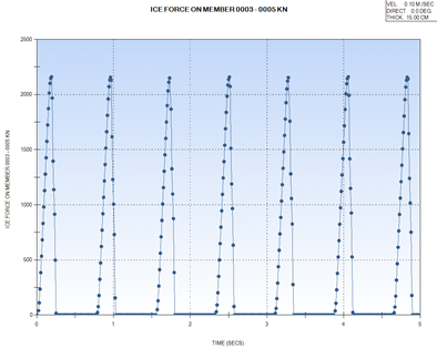 通过定常速前进冰挤压静止立柱模型,将冰破碎长度转换为时间长度。从下图可以看出,从初始接触到挤压强度达到冰破碎长度用约0.193秒,相邻两次初始接触时间间隔约为0.774秒,0.774/0.193约等于4, 即为ICE卡中的Breaking length ratio。