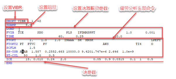 在动力响应输入文件中插入疲劳分析头部命令,冰激振动分析能够自动生成疲劳分析的输入文件ftginp.