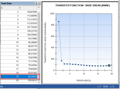 在如下基底剪力传递函数中,可以看到波浪周期19sec作用产生的基底剪力传递函数值86.295