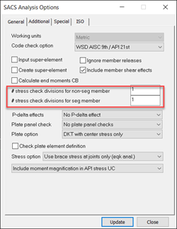 在precede通过Options>Analysis打开SACS Analysis Options对话框,在该对话框中通过设置图一中红色框标记的设置,可以设置应力计算考虑的位置。