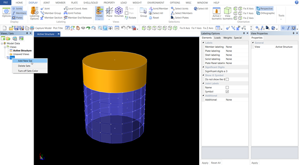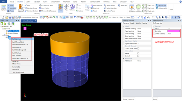 进入prcede打开模型,通过Display>Views>Properties打开Views操作界面,在Views操作界面中通过set>add new set, 创建集合名称,然后选择集合类别,设置集合元素的颜色标记。如下图: