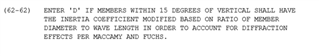 在seastate中,水动力荷载计算公式Morison公式中CD, CM系数设置命令为CDM。在CDM命令第62列存在针对大直径(杆件直径相对于波长较大)杆件惯性力计系数CM的修正选项。当该选项设置为’D’时,将根据Maccamy and Fuchs方法,修正CM系数,考虑波浪绕射效应。