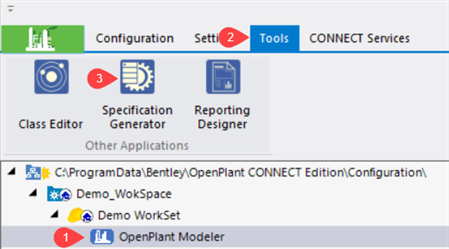 - Click on Tools ribbon tab and select Specification Generator. Refer sequential steps as shown below.
