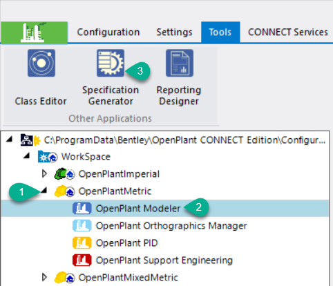 - Select the desired WorkSet, expand the node and click on OpenPlant Modeler and from tools Tab launch Specification Generator.