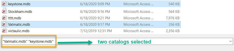 - Select the catalogs to merge from the list. To select multiple catalogs, hold down the <Crtl > button while making your selections and Click Open. The catalogs will be listed in the File Name field. Here , Keystone and Valmatic.